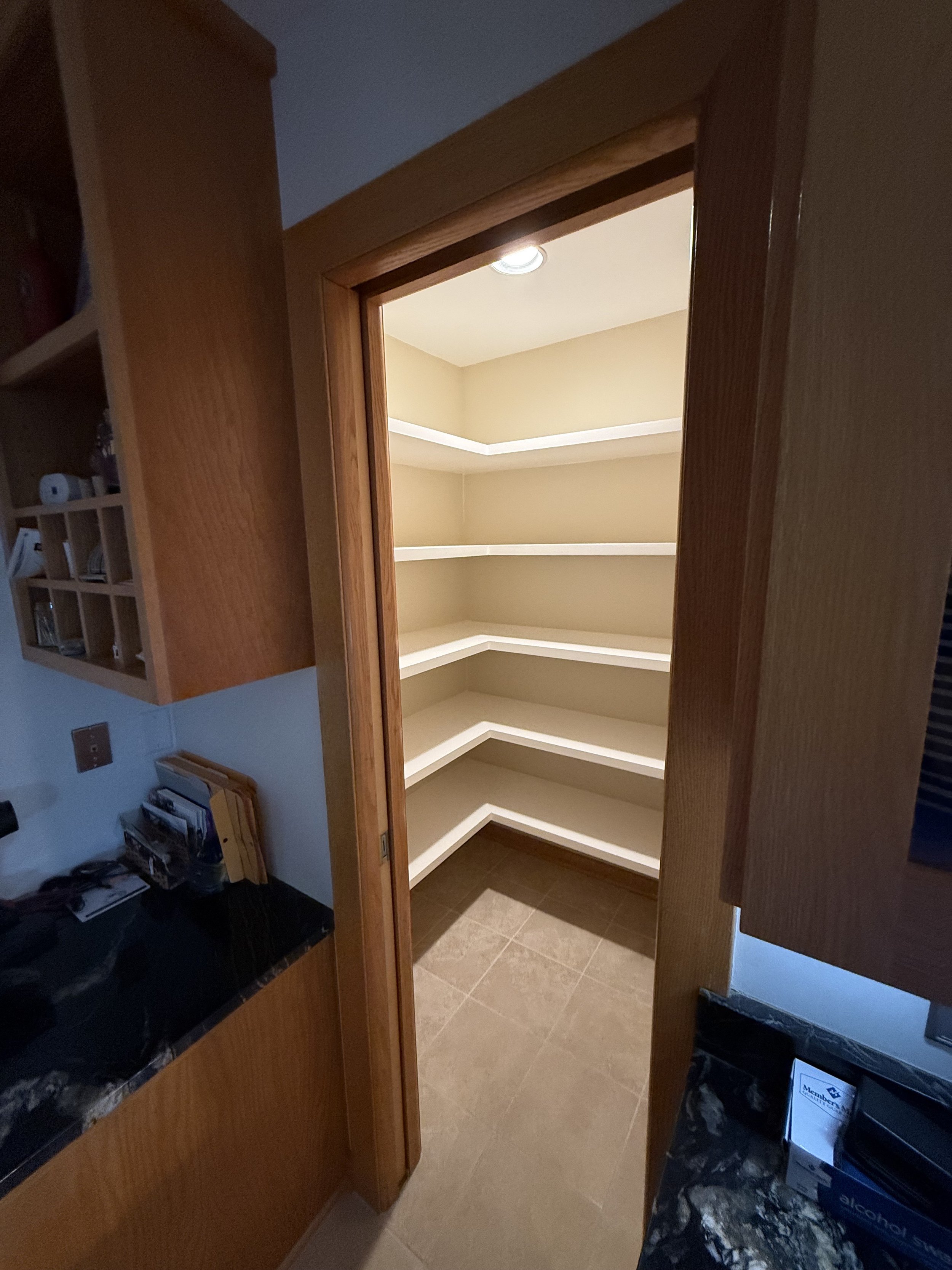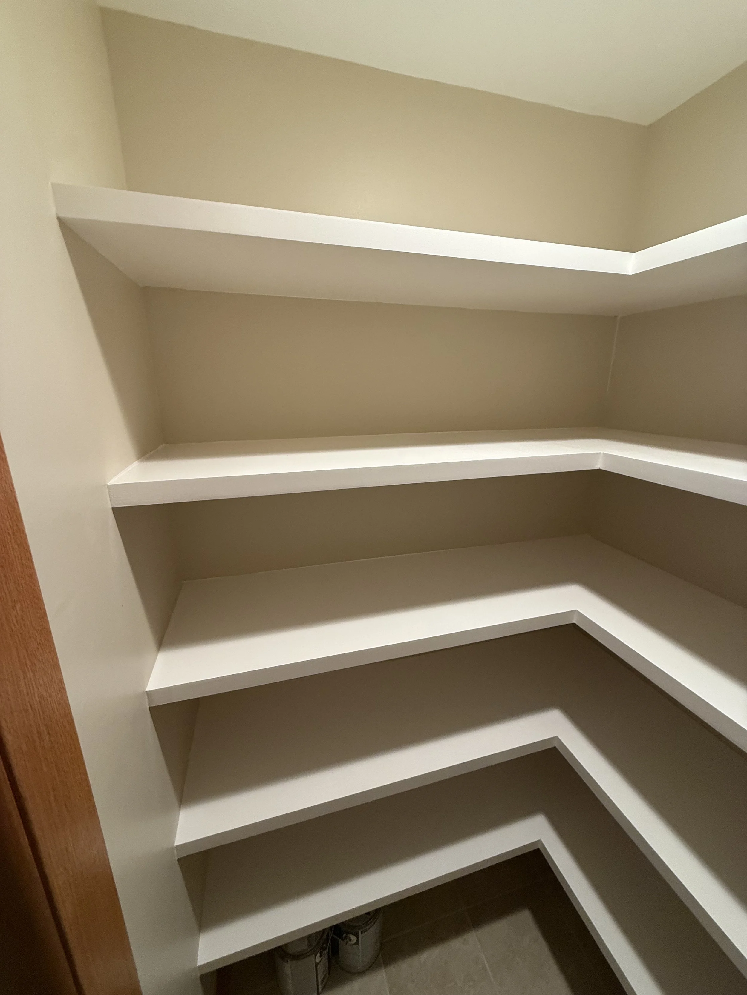 This pantry update completely changes the look of the whole space. raplacing the wire-rack shelving with solid maple floating shelves was the right move to make.
